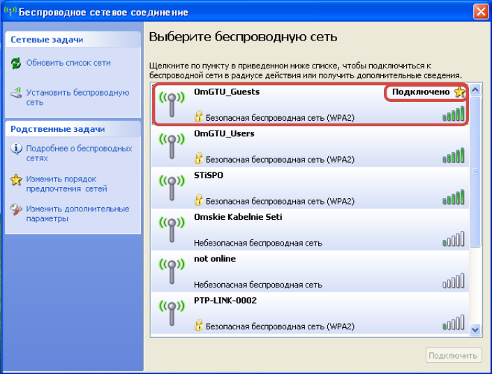 В открывшемся окне выберите беспроводную сеть “OmGTU_Guests”. Затем нажмите кнопку “Подключить” внизу данного окна.