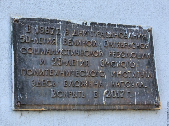 ![]() | Для справки: Капсула была заложена студентами Омского политехнического института в 1967 году. Мероприятие проводилось в дни празднования 25-летия со дня образования института и 50-летия Великой Октябрьской социалистической революции. На мемориальной доске, закрывающей капсулу с посланием, написано: «Вскрыть в 2017 году». |