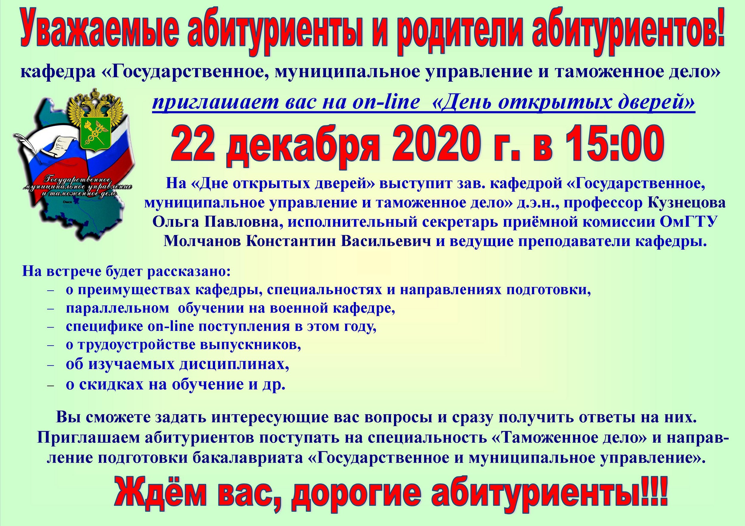 Кафедра «Государственное, муниципальное управление и таможенное дело» приглашает всех желающих на «День открытых дверей», который состоится 22 декабря 2020 г. в 15:00 в режиме on-line