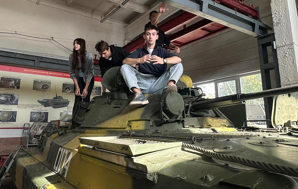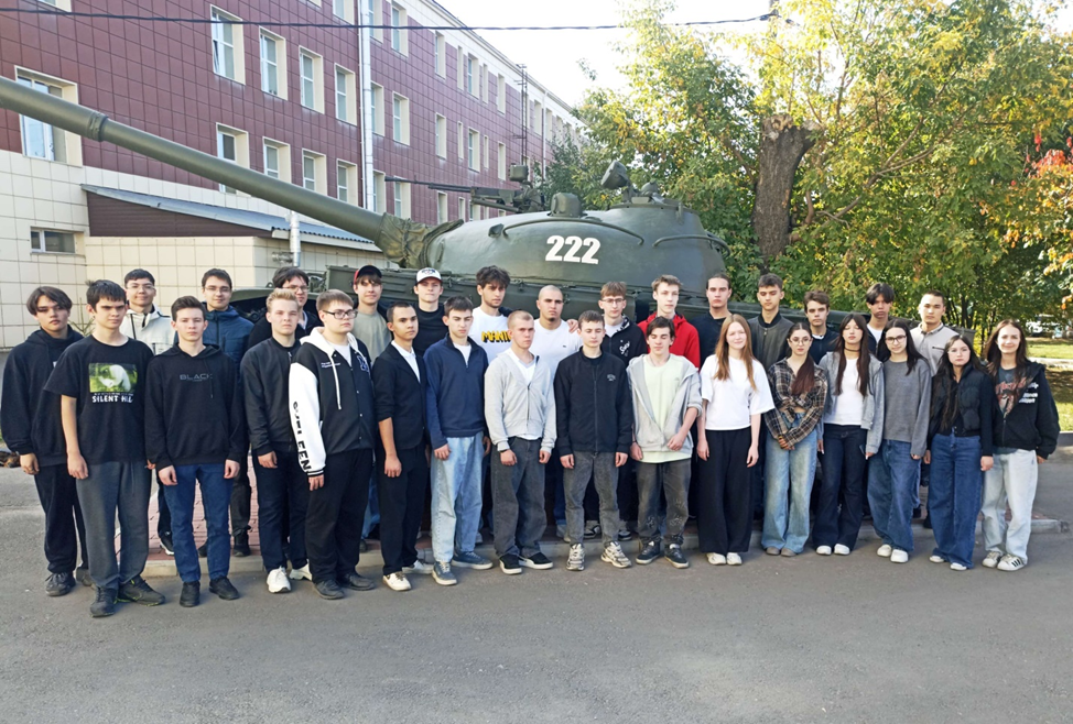 Занятие началось с посещения мемориала погибших на СВО выпускников Военного учебного центра (ВУЦ) при ОмГТУ. Далее студенты колледжа ознакомились с историей военной подготовки в ОмГТУ, военными специальностями по которым готовят в ВУЦ, учебно-материальной базой, а также посмотрели имеющуюся бронетанковую и автомобильную технику: танк Т-72, боевую машину пехоты БМП-2 и автомобиль КАМАЗ.