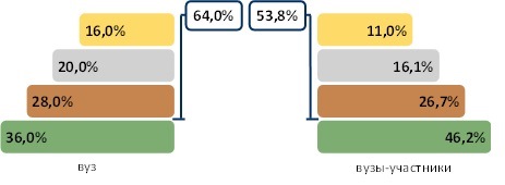 Доля студентов, получивших именной сертификат уровней золотой, серебряный и бронзовый, превышает 50%. При этом доля студентов, получивших сертификат участника, составила 36,0%.