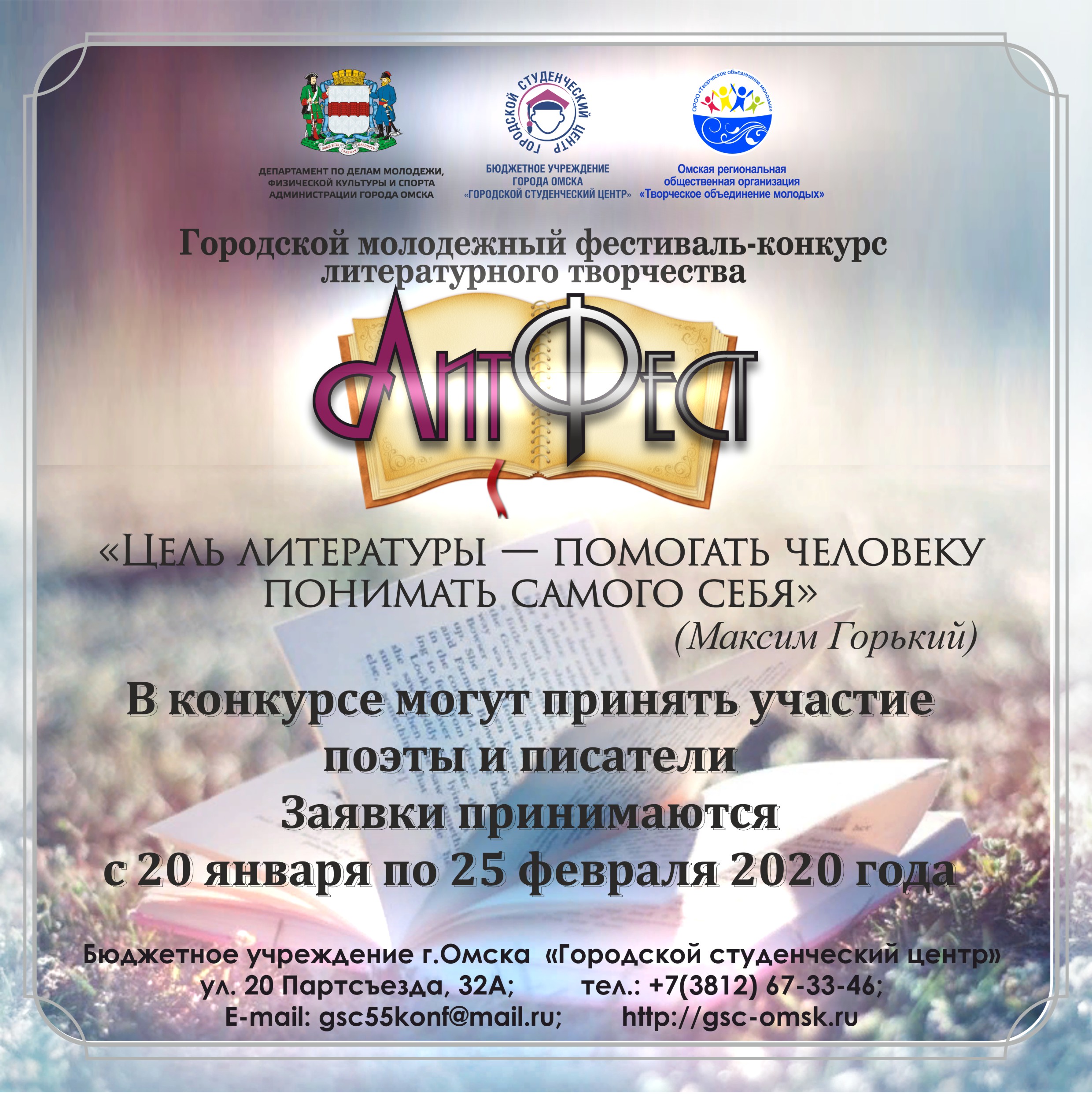С целью создания условий для реализации и развития творческого потенциала молодежи бюджетное учреждение города Омска «Городской студенческий центр» при поддержке департамента по делам молодежи, физической культуры и спорта Администрации города Омска в период с января по март 2020 года проводит городской молодежный фестиваль – конкурс литературного творчества «ЛитФест».