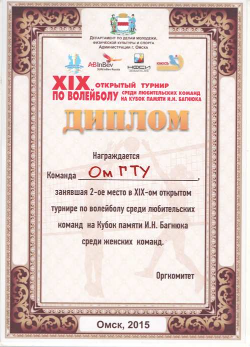 Сборную команду ОмГТУ по волейболу, занявшую 2-ое место в XIX-ом открытом турнире по волейболу среди любительских команд на Кубок памяти И.Н. Багнюка среди женских команд.