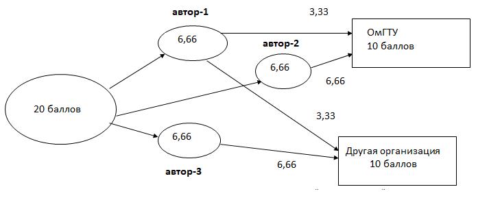 При расчете рейтинговых баллов по стимулирующим доплатам со следующего года будет учитываться доля ОмГТУ в публикации, поскольку в соответствии с методикой расчета КБПР университет получает не все баллы, если есть соавторы из других организаций. Общий балл за публикацию делится между соавторами, а если автор ОмГТУ указал еще и несколько аффилиаций, то его доля делится на все указанные им организации. На рисунке ниже представлена ситуация, в которой автор-2 указал аффилиацию ОмГТУ, автор-1 указал две аффилиации, одна из которой ОмГТУ.