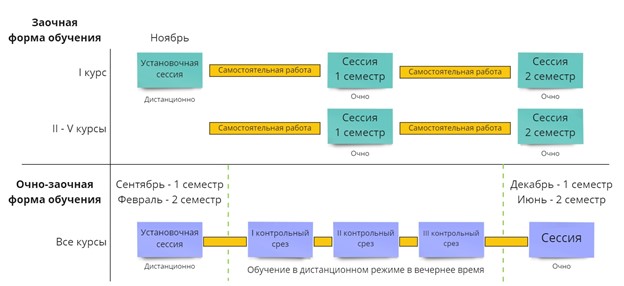 Классическая заочная форма обучения предполагает большую самостоятельность при обучении. На первом курсе пройдет установочная сессия, на ней вы получите задания по дисциплинам первого семестра. Задания выполняете самостоятельно. Сдавать задания нужно будет на сессии, приезжая в институт. Длительность сессии три недели. Взаимодействия с преподавателем в межсессионый период у студентов нет. Установочных сессий больше не будет, на текущей сессии вы будете получать задания на следующую сессию. Хорошо это или плохо - каждый решает сам. Кому-то нравится, что его никто не отвлекает в процессе учебы, а кому-то сложно самоорганизоваться без внешнего стимула.