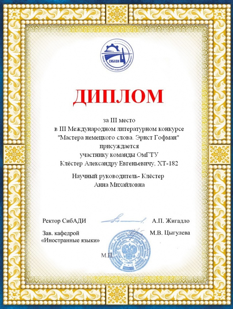 Студенты ОмГТУ стали призёрами международного конкурса в рамках федерального проекта по поддержке и развитию чтения «Шедевры мировой литературы. Эрнст Теодор Амадей Гофман. «Песочный человек / Sandmann». Конкурс был организован кафедрой «Иностранные языки» СибАДИ и состоялся 25 ноября 2021 г.