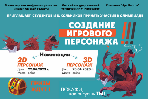 С 23 по 24 апреля 2022 г. в ОмГТУ при организации кафедры «Математические методы и информационные технологии в экономике» и поддержке компании «Арт Восток», клуба «Гейм-дизайн для увлеченных компьютерными играми» пройдет Олимпиада «Создание игрового персонажа»