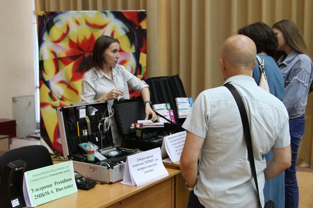 Перед началом собрания абитуриенты и их родители получили возможность ознакомиться с небольшой частью многочисленного лабораторного оборудования кафедры. Инженер кафедры Федоренко Мария Евгеньевна рассказала о принципах работы и назначении приборов из таможенных лабораторий кафедры - мобильной лаборатории оперативного работника МЛ-500; программно-аппаратного методического комплекса на базе портативного бесконтактного КР-спектрометра ИнСпектр R532; лабораторного комплекса №2 М6У для экспресс-анализа топлива; детектора для драгоценных камней Presidium Duo tester; прибора для определения подлинности документов Ультрамаг Presidium 25ИКМ-А Duo Tester. Также она продемонстрировала работу некоторых приборов в действии. Собравшимся была представлена подборка последних публикаций кафедры.