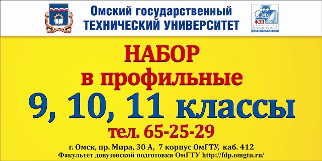 Омский государственный технический университет объявляет набор в профильные 9, 10 и 11 классы на 2016-2017 уч.год для подготовки к ОГЭ, ЕГЭ и поступлению в вузы России. Входное тестирование в 9, 10 и 11-е классы проводится по предварительной записи. Адрес: г. Омск, пр. Мира, 30 А, корпус ОмГТУ № 7, каб.412, тел. 65-25-29, е-mail: fdp@omgtu.ru, сайт: www.omgtu.ru/fdp | ||||||||||||||||||