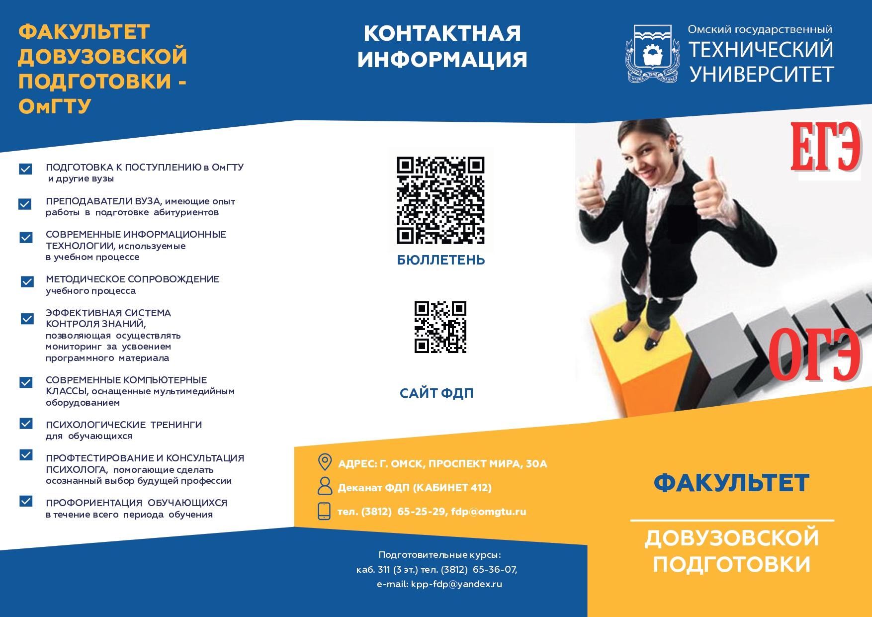 Подготовка к ОГЭ, ЕГЭ и поступлению в вузы РФ. Профильные классы факультета довузовской подготовки ОмГТУ. Предварительная запись на 2017-18 уч. год и подробная информация по тел. 65-25-29 Е-mail: fdp@omgtu.ru Страница ФДП на сайте ОмГТУ: www.omgtu.ru/fdp | ||||||||||||||||||