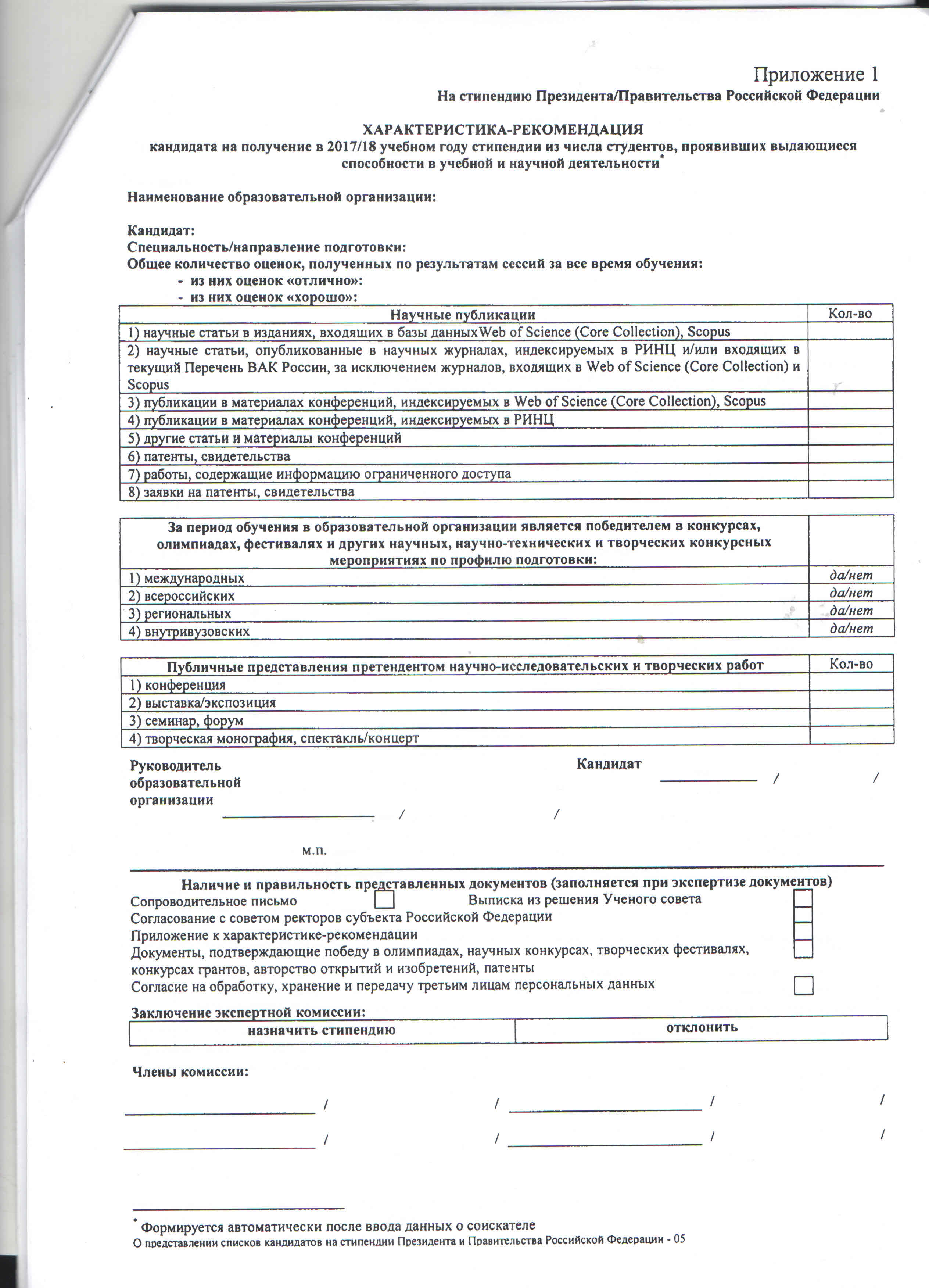 направлениям. 1. Характеристика рекомендация на кандидата на получение стипендии. (Пример прилагается) 2. Заверенная справка об успеваемости за весь период обучения - заполняется в деканате. 3. Подписанное кандидатом согласие на обработку персональных данных - заполняется в деканате. 4. Заявление на включение в отбор. |