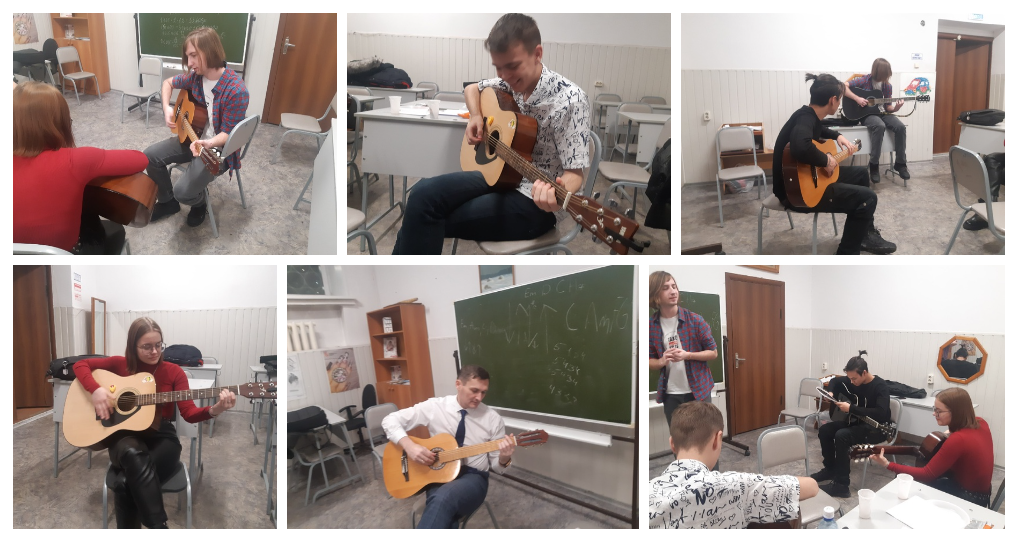 Большинство ребят учатся играть на шестиструнной гитаре "с нуля" и уже готовы продемонстрировать свои первые "успехи" (см. видеоролики). Сейчас идет активная подготовка коллективного музыкального номера.