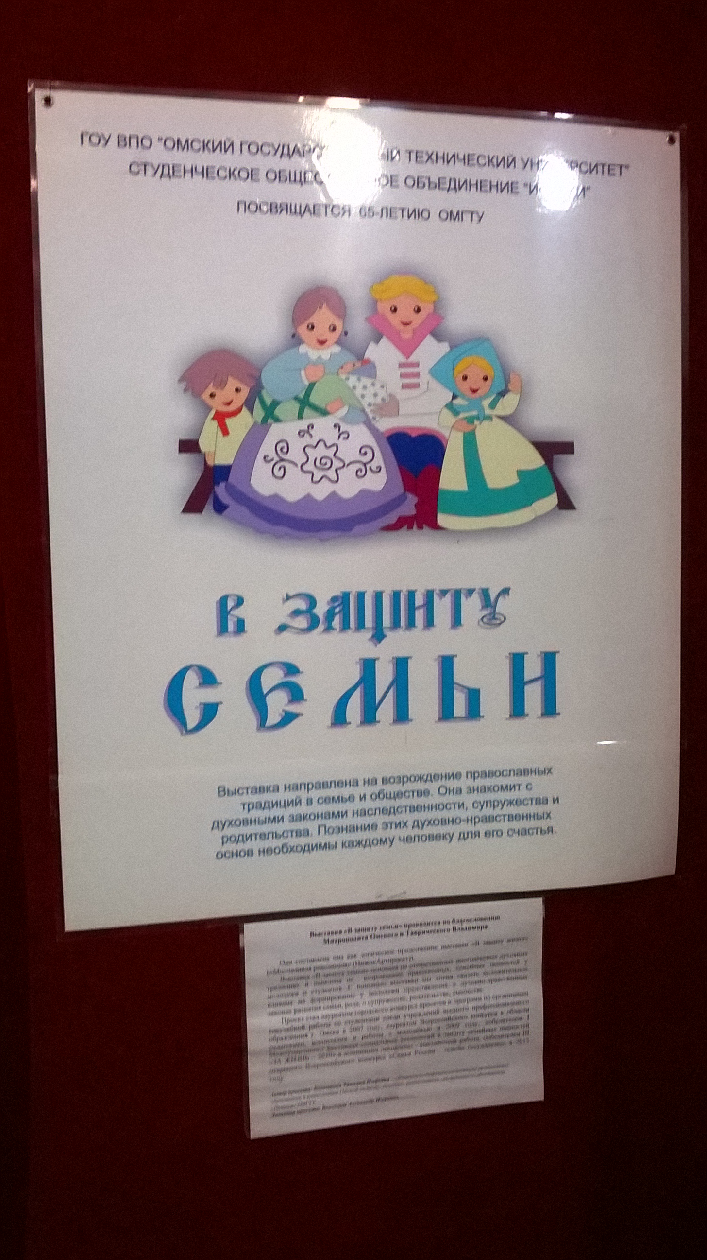 8 и 9 ноября 2017 году студенты 1 курса ФЭУ посетили выставку "В защиту семьи" в музеи ОмГТУ. Выставка направлена на возрождение православных традиций в семье и обществе. Студенты проявили интерес к выставке, познакомились с духовными законами наследственности, супружества и родительства.