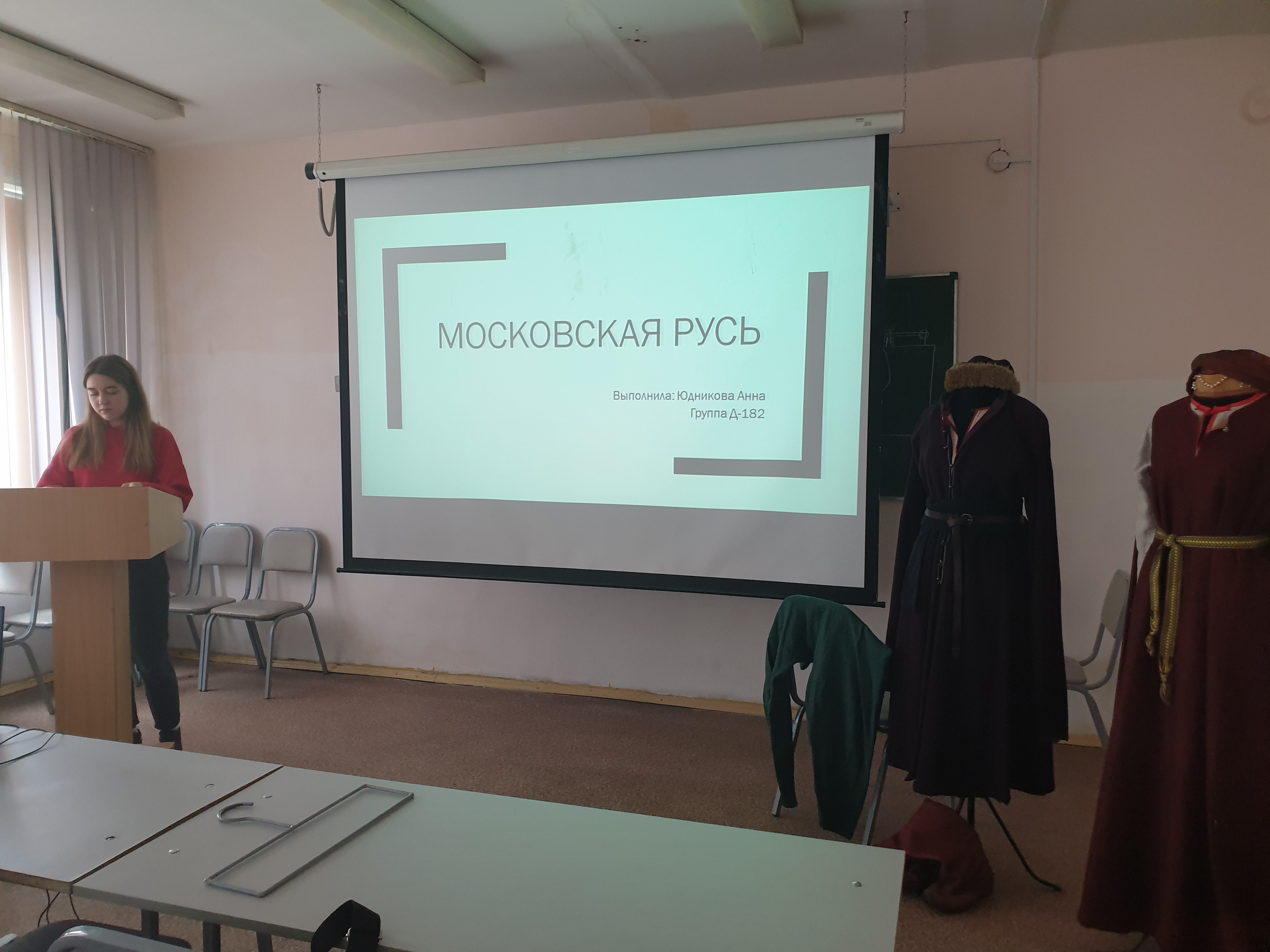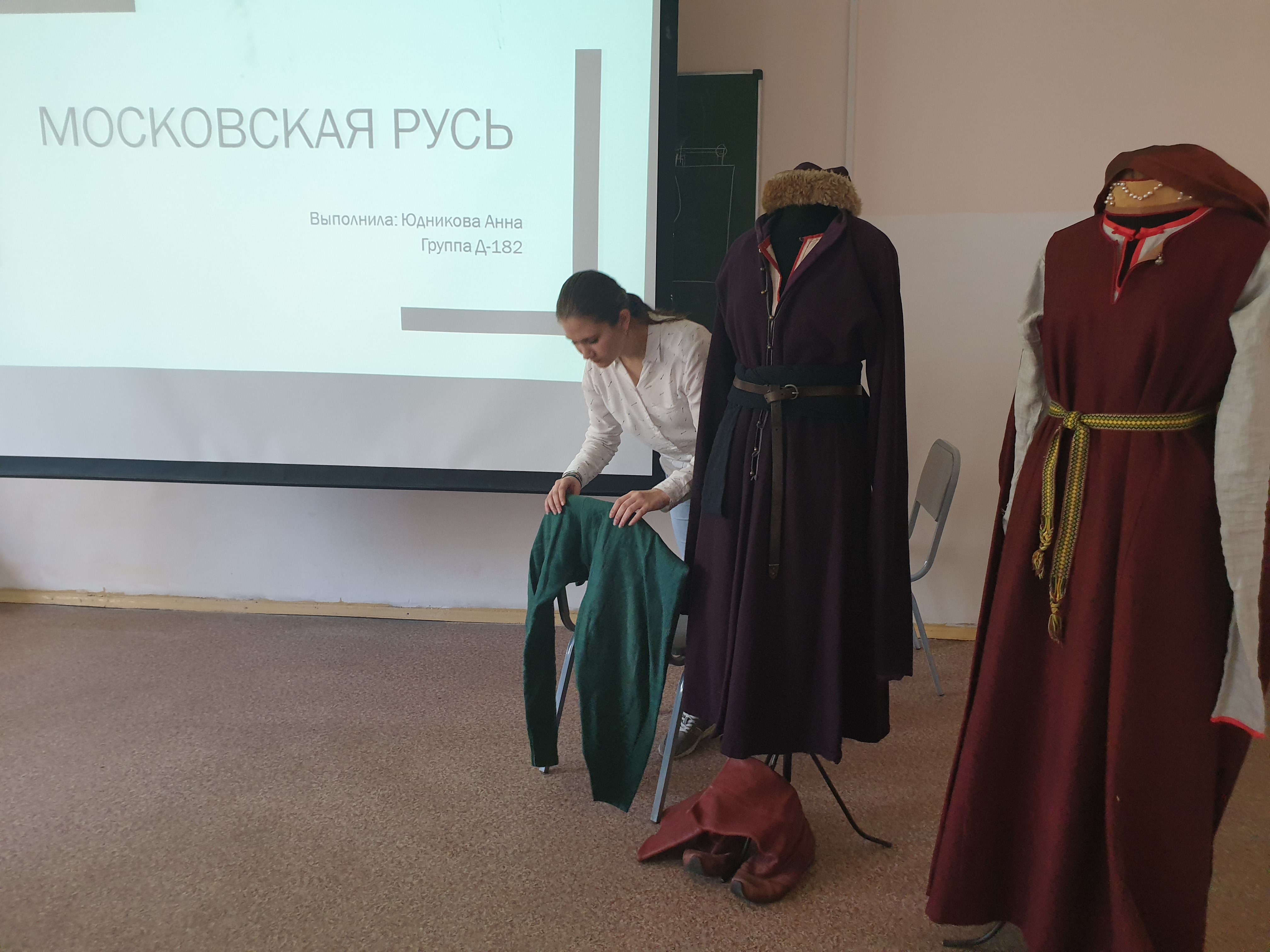 Студентка Екатерина Сапегина, 1 курс, гр. д-182 представляет тему: мужской и женский костюм Московской Руси.Руководитель: доцент, к.п.н Амиржанова Аина Шугаевна.Занятия проводятся в форме коллоквиума с обсуждением наиболее интересных и полезных для изучения моментов.