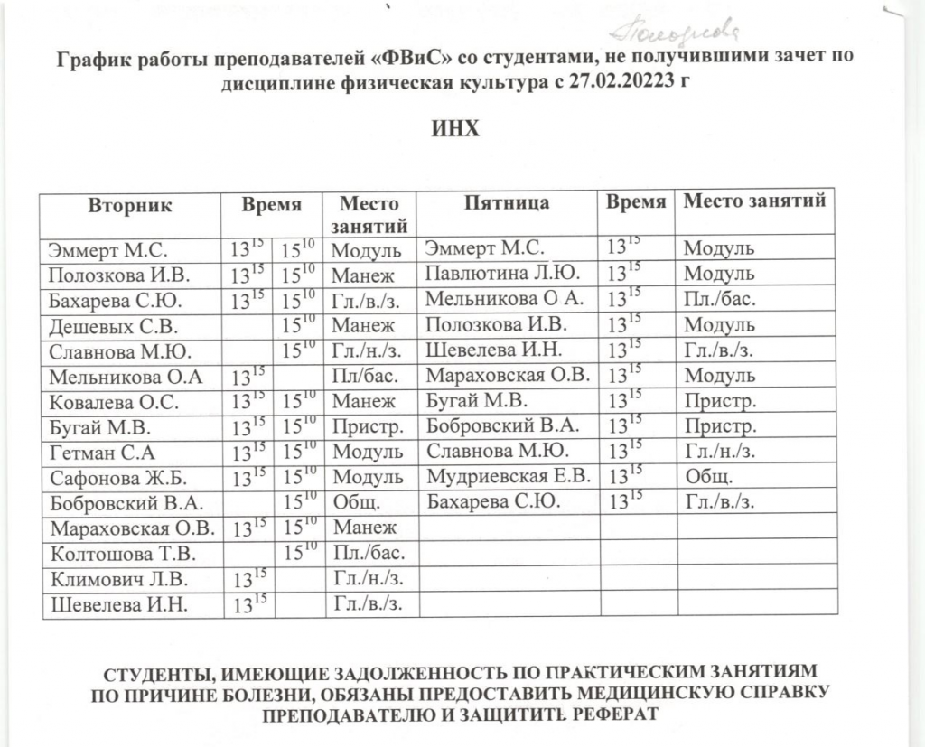 ВНИМАНИЕ!!! Уважаемые студенты, просим ознакомиться с Графиком ликвидации задолженностей кафедры "ФИЗИЧЕСКОЕ ВОСПИТАНИЕ И СПОРТ" (комиссионная пересдача) по итогам ВЕСЕННЕГО семестра 2022-2023 учебного года.