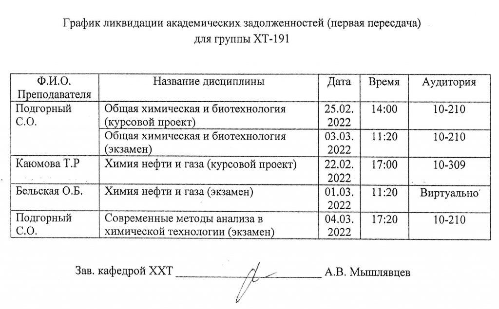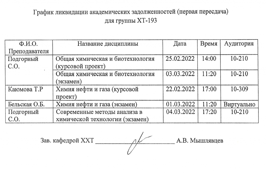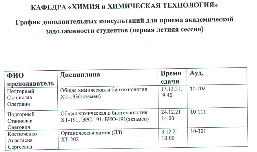 ВНИМАНИЕ!!! Уважаемые студенты ВЫПУСКНЫХ КУРСОВ, просим ознакомиться с Графиком ликвидации задолженностей кафедры "ХИМИЯ и ХИМИЧЕСКАЯ ТЕХНОЛОГИЯ" по итогам ЛЕТНЕГО семестра 2022-2023 учебного года.