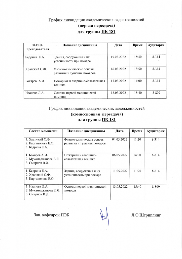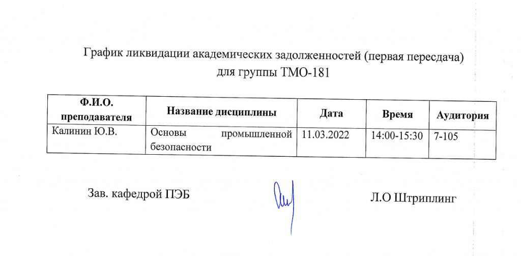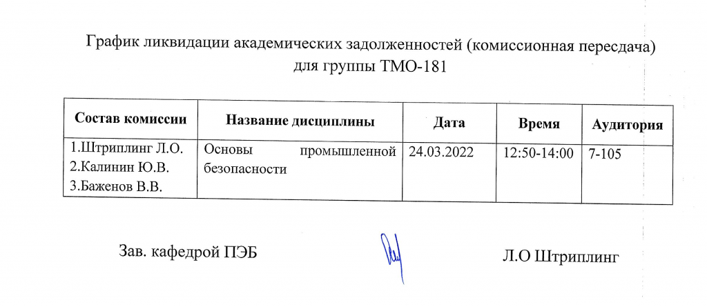 ВНИМАНИЕ!!! Уважаемые студенты, просим ознакомиться с Графиком ликвидации задолженностей кафедры "ПРОМЫШЛЕННАЯ БЕЗОПАСНОСТЬ" (комиссионная пересдача) по итогам осеннего семестра 2022-2023 учебного года.