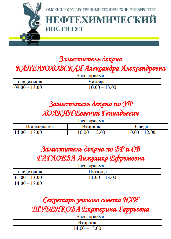 ЧАСЫ приема заместителей декана НХИ на второй семестр 2020/21 учебного года