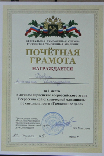 2 место в конкурсе по заполнению электронной декларации также было присвоено студентке группы ТД-113 Дербуш Анастасии Александровне. За второе место по заполнению декларации Анастасия получила почетную грамоту, памятный кубок призера Всероссийской студенческой олимпиады по специальности «Таможенное дело» и годовую лицензию на пользование программой электронного декларирования «Альта-софт».