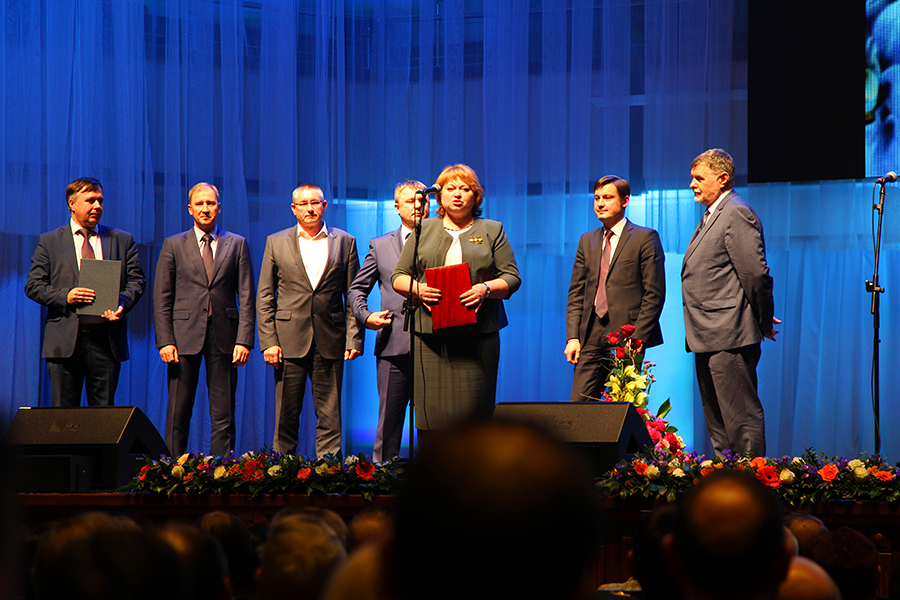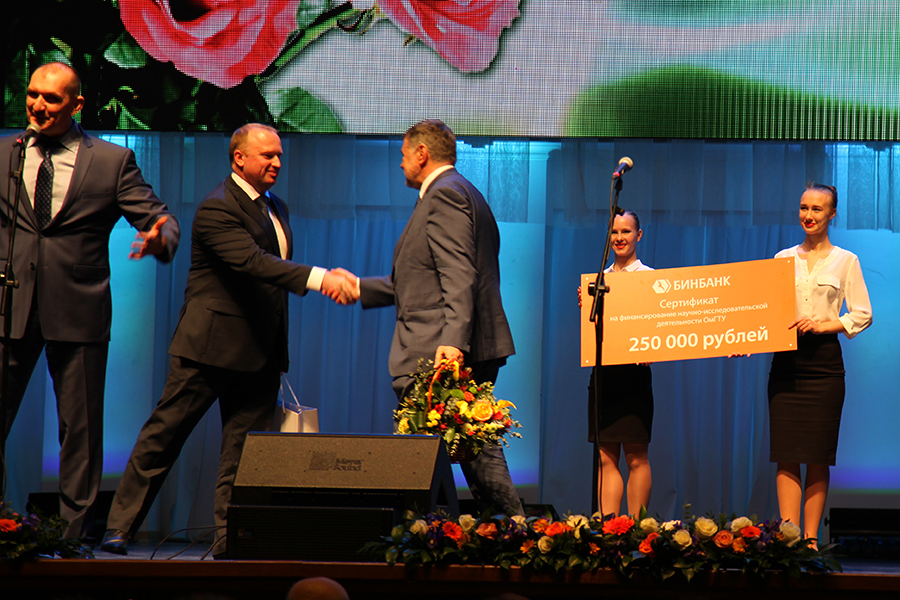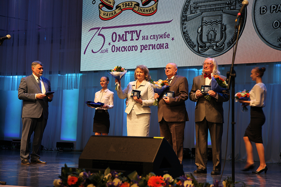 В ходе праздника были вручены награды разных уровней. Так Александр Бурков после поздравления вручил грамоту за многолетний безупречный труд и в связи 75-летием вуза Дмитрию Маевскому, первому проректору ОмГТУ, и «Знак «Почетный работник в сфере высшего образования Российской Федерации» Владимиру Юше, декану НХИ.