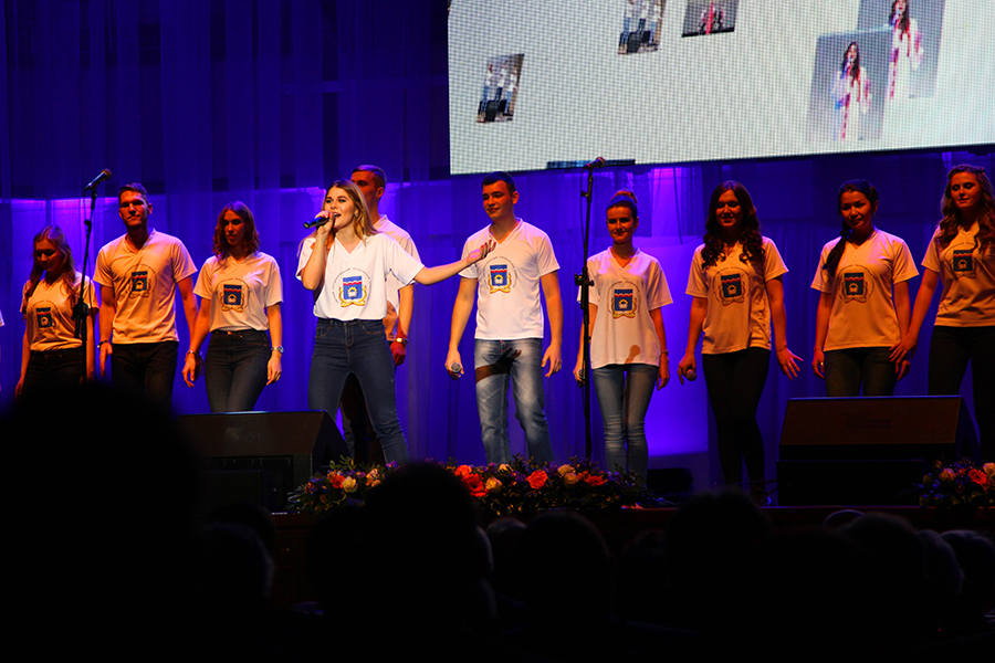 Финальная сцена заполнила зал праздничными шарами с символикой «ОмГТУ - 75 лет на службе Омского региона» и песней «МЫ – ЕДИНОЕ ЦЕЛОЕ» в исполнении сводного хора студенческих художественных коллективов ОмГТУ.