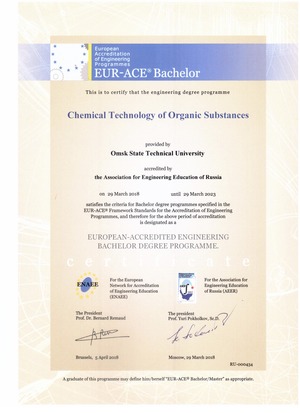 Образовательная программа базовой кафедры ПАО "Газпром нефть" – "Химическая технология" по профилю "Химическая технология органических веществ" получила профессионально-общественную аккредитацию Ассоциации инженерного образования России и сертификацию Европейской сети по аккредитации в области инженерного образования.Программе подготовки бакалавров был присвоен "Европейский знак качества" - EUR-ACE* Label. Образовательная программа внесена в реестр аккредитованных программ Ассоциации инженерного образования и Европейской сети инженерного образования (ENAEE). Данный сертификат, действующий 5 лет, подтверждает высокое качество реализуемых инженерных программ в высших учебных заведениях не только в России, но и за рубежом.