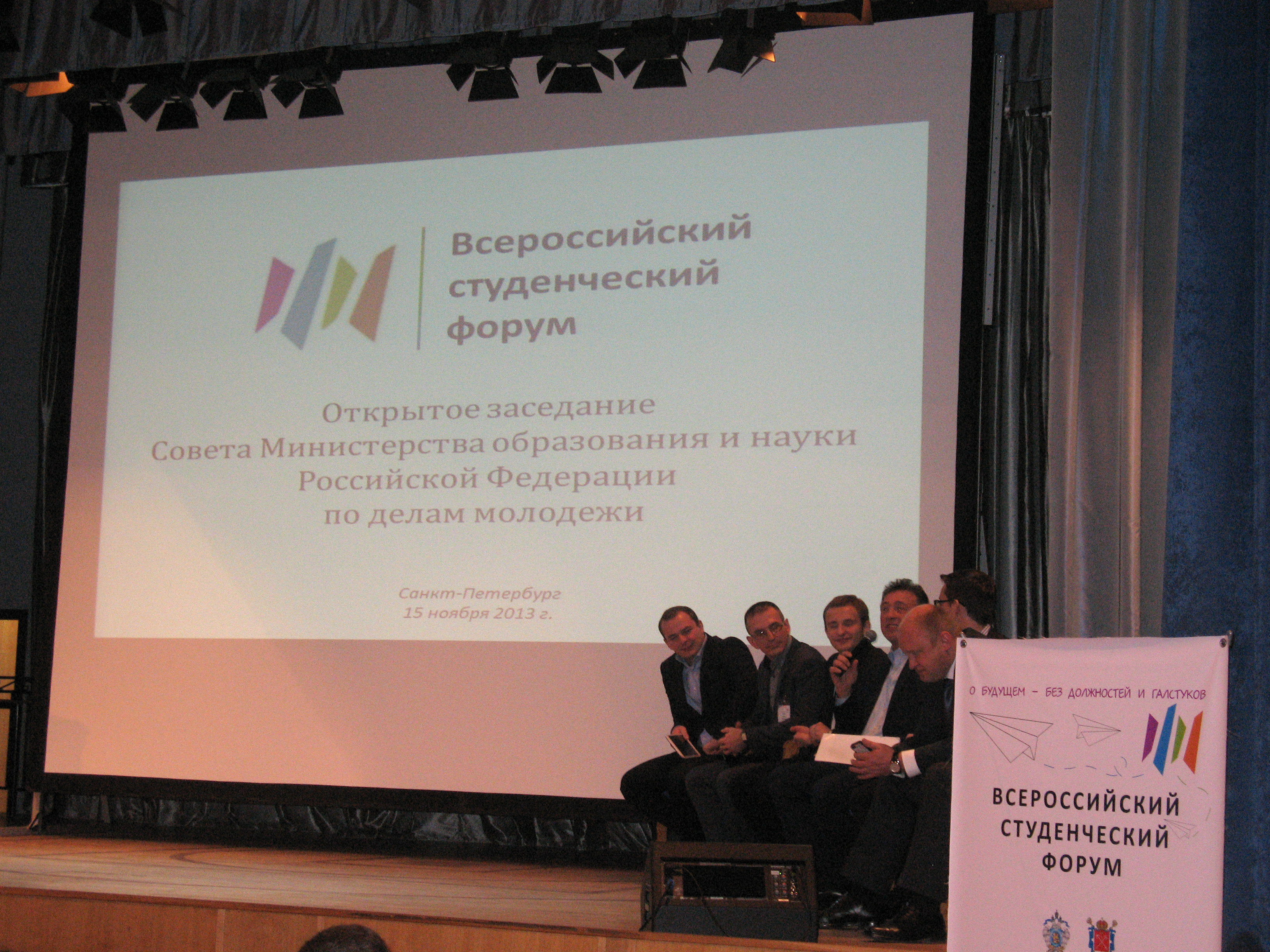 С 12 по 16 ноября 2013 года в г. Санкт – Петербурге состоялся Всероссийский студенческий форум «О будущем – без должностей и галстуков», организатором которого выстуапило Министерство образования и науки Российской Федерации при участии Федерального агентства по делам молодежи, заинтересованных федеральных органов исполнительной власти и общественных организаций Российской Федерации.Форум проводился с целью активного вовлечения молодежи в реализацию государственной молодежной политики через формирование проектных инициатив, развитие активной жизненной позиции молодежи и студенчества как кадрового резерва экономики страны.