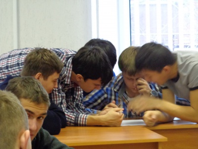 В аудитории присутствовали болельщики, поддерживающие своих сокурсников, и преподаватели, готовившие команды к олимпиаде – доценты кафедры «Отечественная история» В.В. Гермизеева, Р.В. Рыбаков, А.В. Рычков, старший преподаватель Т.В. Глазунова.
