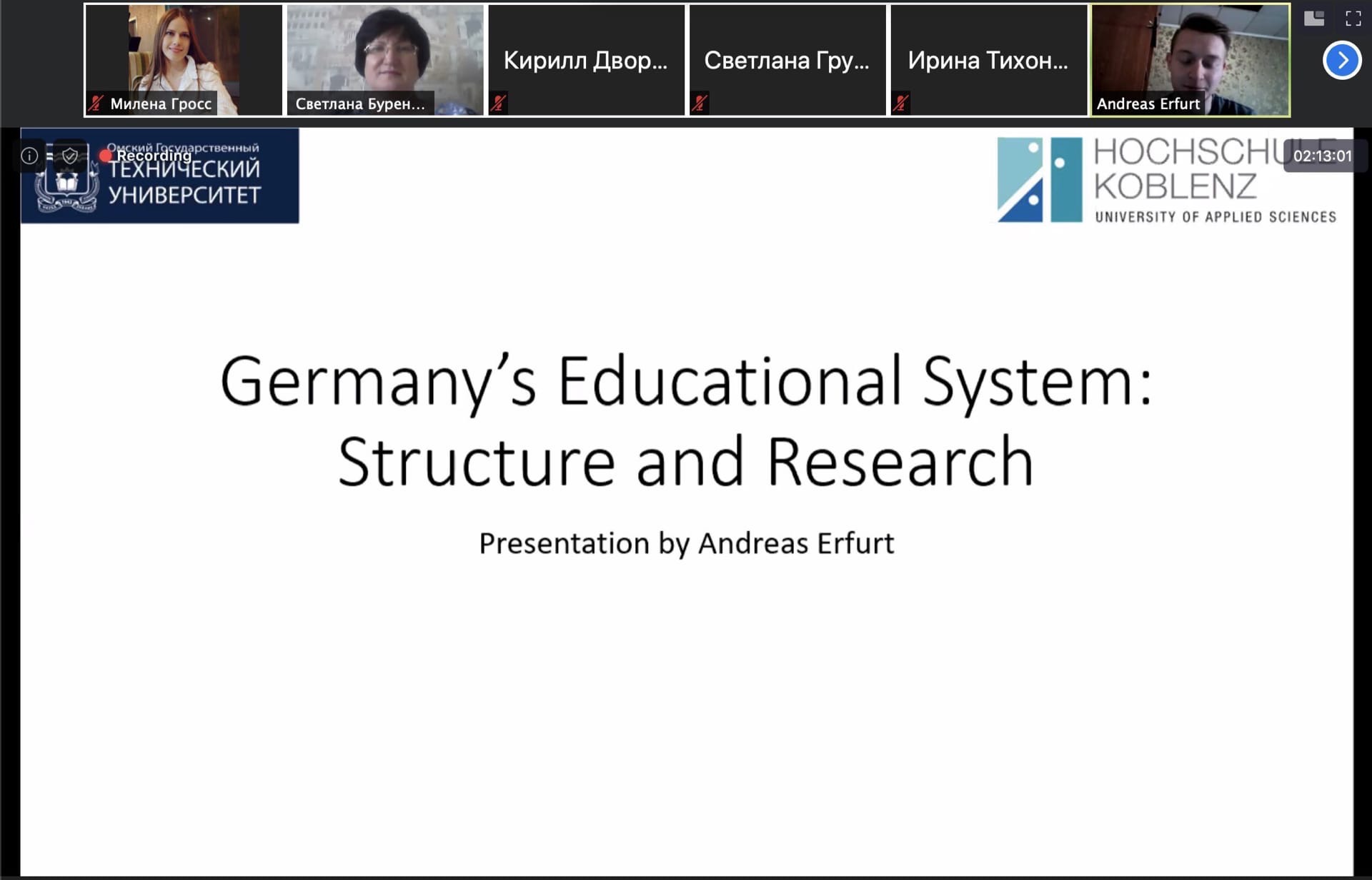 В завершении пленарного заседания был заслушан доклад Андреаса Эрфурта, студента Кобленского Университета Прикладных Наук (Германия) об основных элементах и отличительных особенностях современной образовательной системы Германии. Отметим, что на данный момент Андреас обучается в ОмГТУ на кафедре «Электрическая техника» благодаря Германской службе академических обменов (DAAD). Преподавателями ОмГТУ для него был разработан годовой индивидуальный план стажировки, который в полной мере смог компенсировать отсутствие студента в своем родном университете и, в некоторой степени, даже превзойти его образовательную программу.