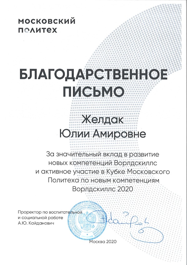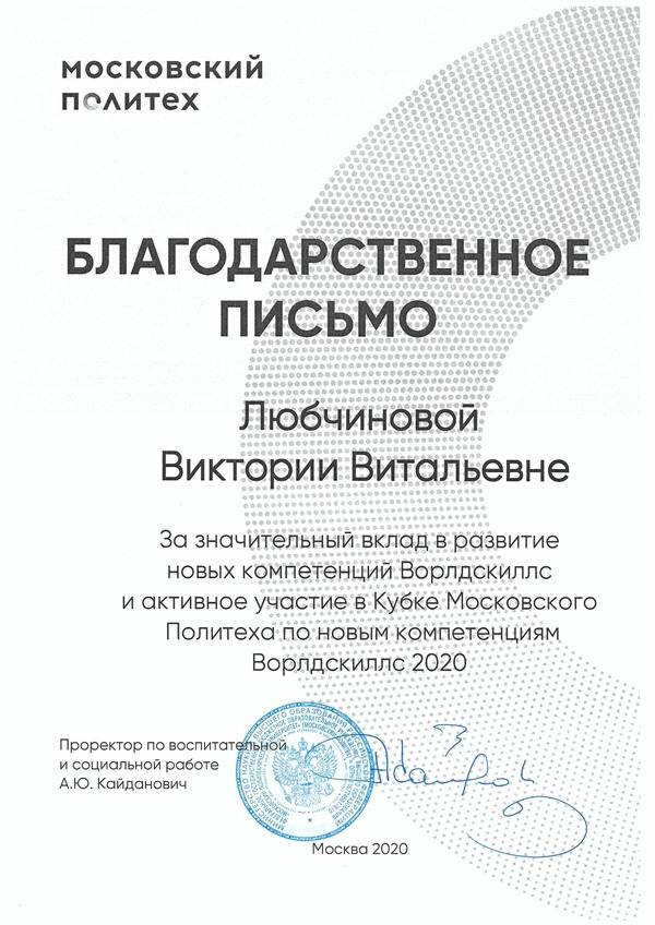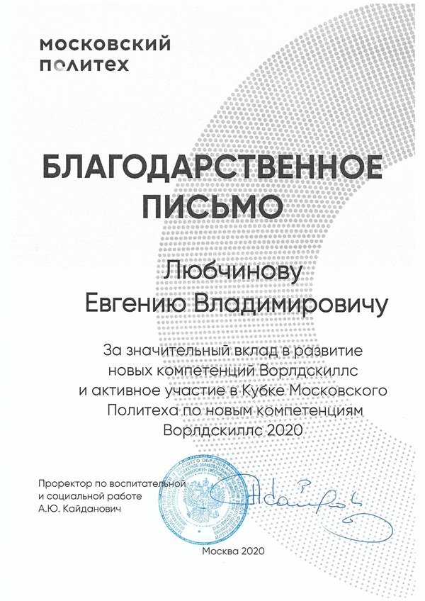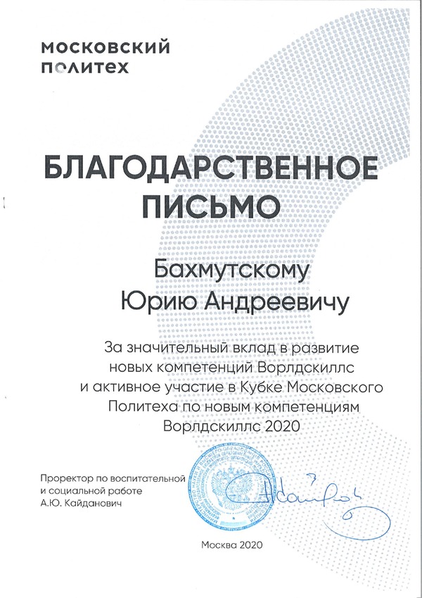 С 6 по 11 октября 2020 года в очно-дистанционном формате состоялся первый открытый Кубок Московского политехнического университета но новым компетенциям Ворлдскиллс 2020: «Порошковая металлургия», «Прикладной форсайт» и «CAE-инжиниринг». В соревнованиях приняли участие крупнейшие вузы Российской Федерации: Московский физико-технический институт, Московский политехнический университет, Московский авиационный институт, Национальный исследовательский ядерный университет «МИФИ», Мордовский государственный университет имени Н.П. Огарева и другие.