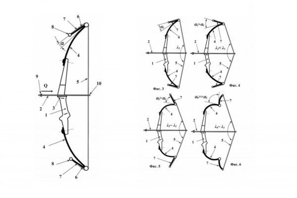Уменьшение габаритов лука при ненатянутой тетиве происходит за счет оригинальной конструкции концов плеч лука, которые сначала находятся как бы в сложенном состоянии и затем «распрямляются» только в процессе натяжения тетивы, то есть во время выстрела. Мощность лука – это вообще сложное понятие. С точки зрения механики – это произведение силы на путь (работу) за единицу времени. Для одного и того же стрелка путь (длина натяжения тетивы) один и тот же, а вот сила, которую придает тетиве лук, может распределяться вдоль этого пути по-разному. В обычном луке максимальная сила действует в начале пуска стрелы, когда она еще неподвижна. Это вызывает в начале движения стрелы большие силы инерции, из-за которых стержень стрелы теряет устойчивость, и она начинает колебаться. А это отрицательно влияет как на точность выстрела, так и на его мощность. Конструкция рычагов, на которых натянута тетива в наших изобретениях, позволяет снизить начальную силу, действующую на стрелу, и сделать ее максимально возможной, когда стрела уже начала движение. Это и позволяет повысить мощность выстрела без потери его точности.