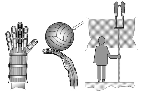 Старое устройство представляло собой пучок гибких нитей (например, обычной рыболовной лески диаметром около 0,5-1 мм), сформированной в виде части предплечья и кисти руки, закрепленной на вертикальной стойке и вставленное в резиновую перчатку. Новое отличается тем, что поверх пучков гибких нитей, имитирующих пальцы, надеты и зафиксированы трубки из эластичного материала. Количество этих трубок, надетых на каждый палец, на одну меньше, чем количество фаланг пальцев, а длина трубки меньше, чем длина фаланги, на которую она надета, на 2-4 мм. Причем на последнюю фалангу надет и закреплен колпачок из эластичного материала, длина которого меньше, чем длина фаланги на 2-4 мм. Такое устройство практически полностью имитирует кисть человека и ее реакцию на удар мяча. Как тренажер работает и где можно использовать? Тренажер представляет собой вертикальную стойку, на конце которой на поперечине закреплены имитаторы поднятых вверх рук блокирующего игрока. Стойка нижним концом упирается в пол, и ее удерживает в руках тренер или кто-то из игроков. Ее можно легко передвигать из стороны в сторону во время совершения нападающего удара, имитируя действия блокирующего. При этом имитатор можно придвигать к сетке или отодвигать от нее. Он может быть неожиданно для нападающего игрока поднят в любом месте. То есть, по существу, с помощью такого тренажера можно действовать очень близко к реальному поведению блокирующего игрока. При этом действовать разнообразно и очень точно в соответствии с целью тренировки, что практически невозможно при использовании «живого» блокирующего. Приспособление может быть применено при тренировке спортсменов-игроков, отрабатывающих нападающие действия с использованием тренажерных устройств в волейболе, баскетболе, гандболе. |