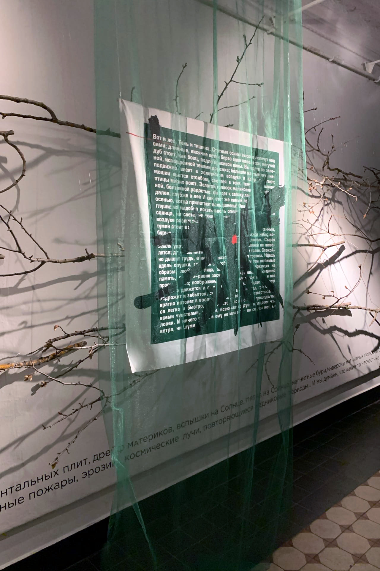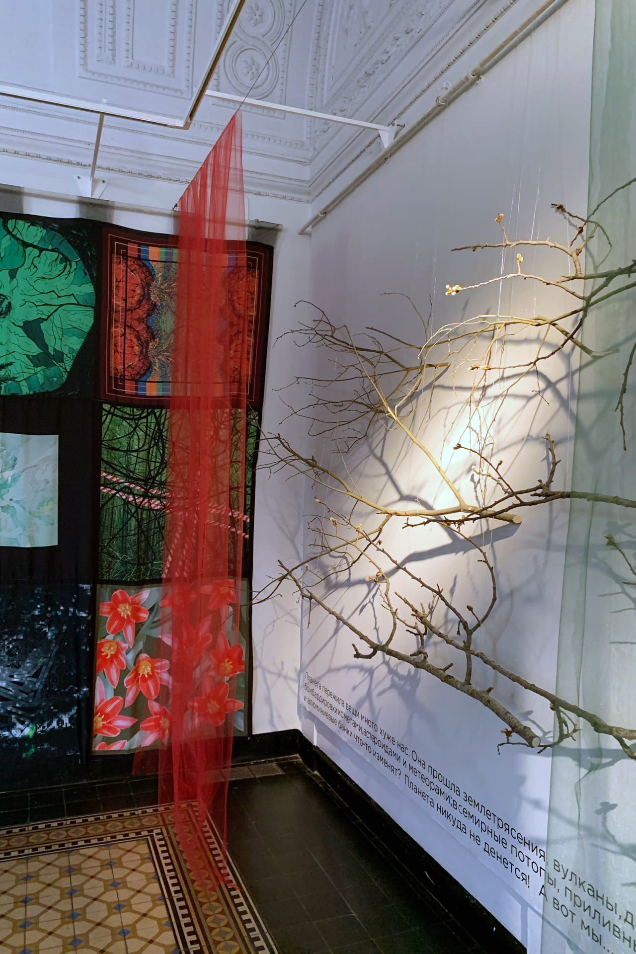 Первый показ передвижной выставки проекта состоялся еще в конце января в Омске – в омском Музее дизайна и технологий ОмГТУ. В Санкт-Петербурге увидеть экспозицию можно будет до 8 марта, а уже после проект отправится в Кострому. В каждом из выставочных пространств интерактивная инсталляция обретает новую форму. Ее основу составляют текстильные объекты – авторские платки, выполненные специально для проекта в одной из трех концепций: «черный лес», «красная зона», «зеленая надежда». Зритель инсталляции проходит путь от размышлений об экологической катастрофе к надежде на восстановление экологического равновесия.
