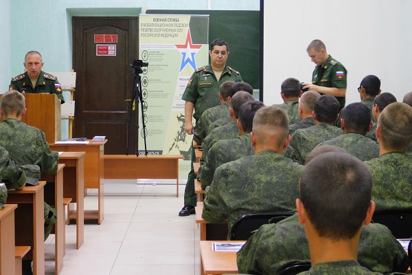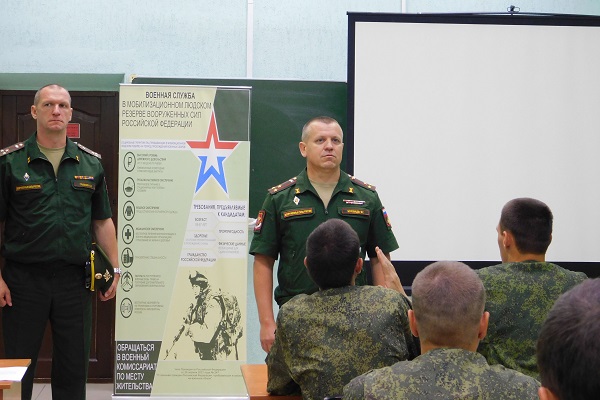 Помимо этого, с выпускниками были проведены мероприятия по зачислению на военную службу в мобилизационный людской резерв Вооруженных Сил Российской Федерации и на военную службу по контракту. В числе организаторов встречи – врио военного комиссара, полковник Виталий Муромцев, начальник 2-го отдела, полковник Алексей Крошко, а также начальник пункта отбора на военную службу по контракту, подполковник Эдуард Тимирбулатов. Они рассказали о требованиях, предъявляемых к кандидатам, социальных гарантиях для лиц, пребывающих в резерве, порядке действий при принятии положительного решения, а также ответили на все вопросы выпускников военного учебного центра.