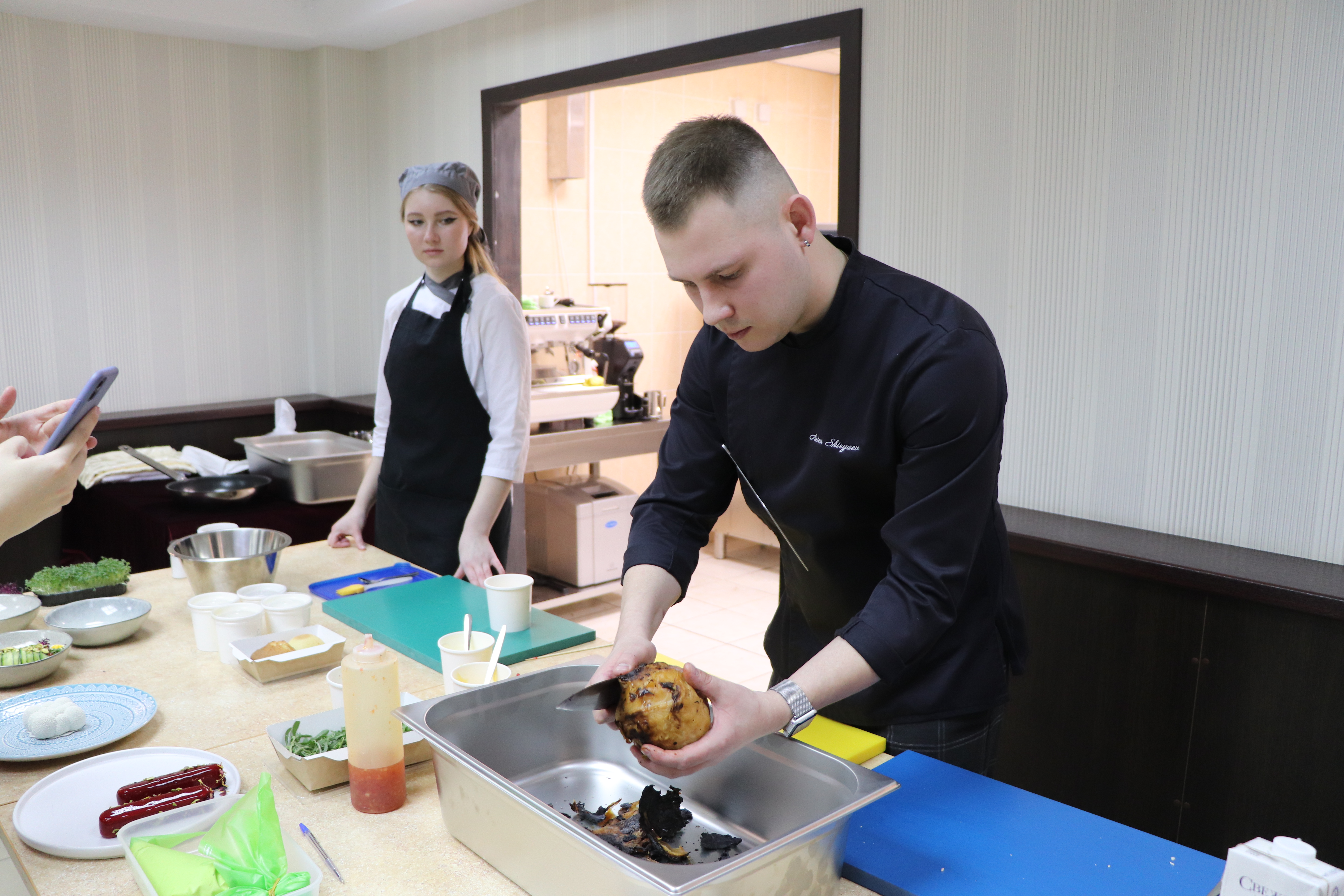 Далее присутствующие смогли стать участниками мастер-класса выпускника ОмГТУ, ныне шеф-повара Pafos cafe Артема Ширяева. Он поделился своим опытом, а также раскрыл секреты приготовления некоторых блюд.