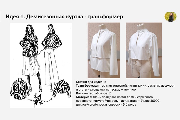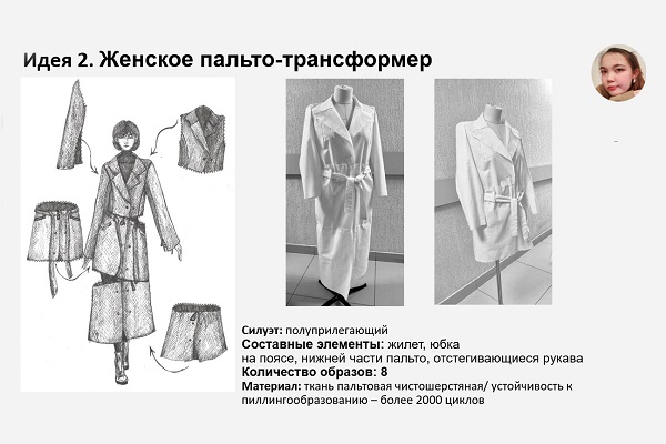 Лилия Юферова, наставник проекта «Одежда-трансформер», доцент кафедры «Конструирование и технология изделий легкой промышленности» ОмГТУ: «Тема нашего проекта инициирована тем фактом, что на сегодняшний день индустрия моды является одной из наиболее загрязняющих в мире. Причина давления на окружающую среду – рост потребления одежды с одновременным сокращением ее жизненного цикла. В рамках проекта представлено решение по двум направлениям: проектирование швейных изделий с элементами трансформации – потребитель, приобретая одну вещь, приобретает несколько, а также проектирование из экологически предпочтительных материалов с высокими показателями долговечности и износостойкости. В ходе работы студентами осуществлен эскизный поиск принципиальных решений проблемы с элементами трансформации, реализован подбор материалов, разработаны конструкции деталей, изготовлены и продемонстрированы макеты прототипов. Представлены идеи по модификации женской куртки, пальто, нарядного платья, блузы и других видов швейных изделий». |