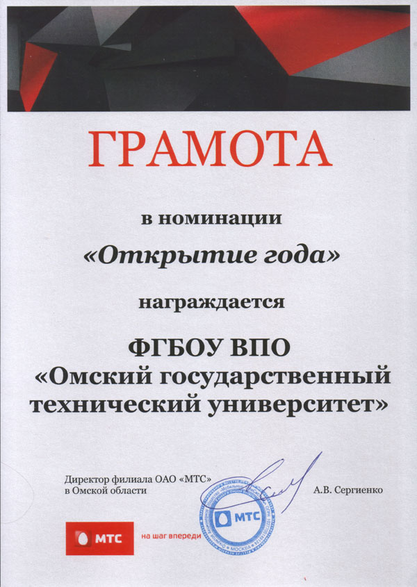 Давний партнёр университета, ОАО "МТС", отметил разработки Центра телекоммуникаций и вычислительной техники ОмГТУ в области программного обеспечения и технологий связи.
