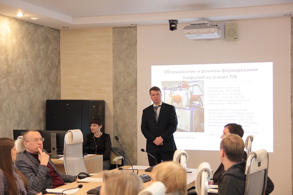 Аспирант Ренат Каменов представил образцы режущего инструмента для обработки специализированных мелкоразмерных канавок в труднообрабатываемых материалах, а старший научный сотрудник НОРЦ «Нанотехнологии» Петр Корусенко ознакомил с разработанной в рамках проекта методикой комплексной экспресс-диагностики наноструктурных топокомпозитных покрытий.