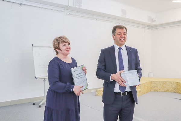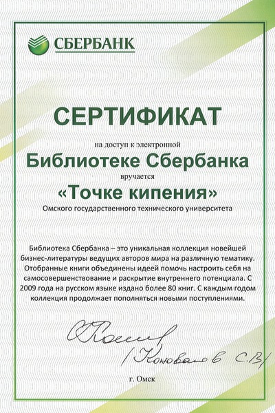 В завершении встречи управляющий омского отделения вручил сертификат на доступ к электронной библиотеке Сбербанка программному директору Точки кипения Наталье Мельниковой для общего пользования внутри университета.