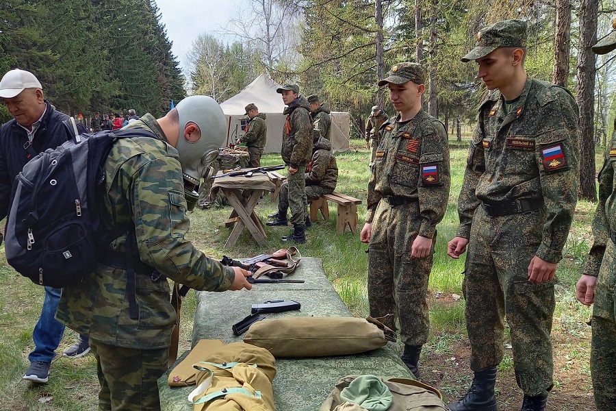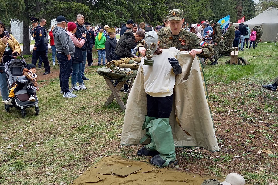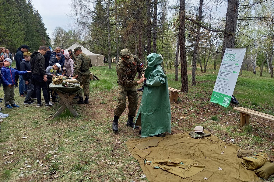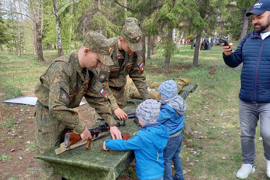 Воспитанники военного учебного центра также организовали интерактивные площадки в парке Победы. Здесь все желающие могли потренироваться в сборке оружия, а также примерить на себя средства защиты.