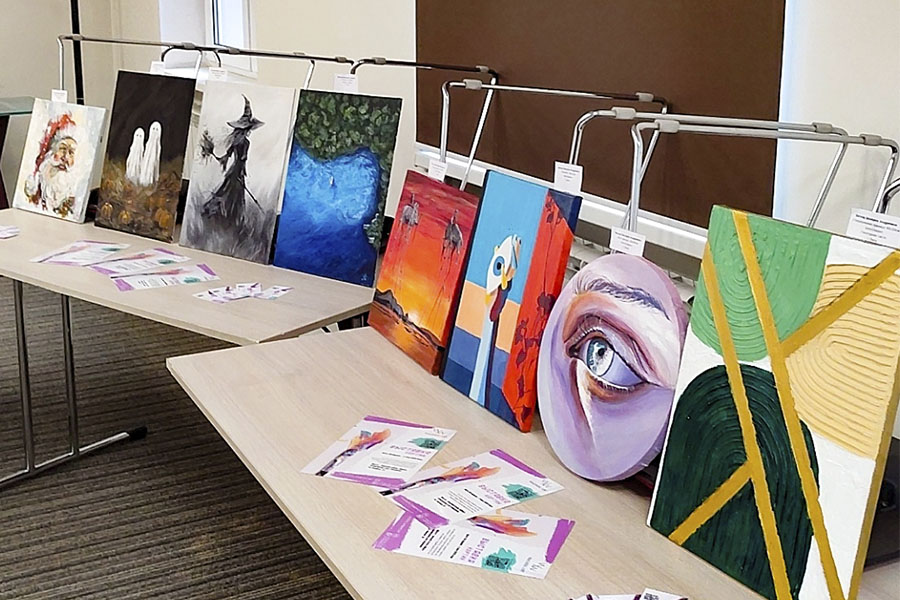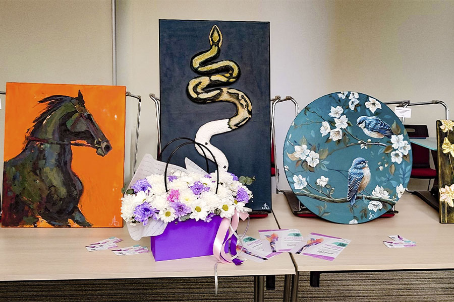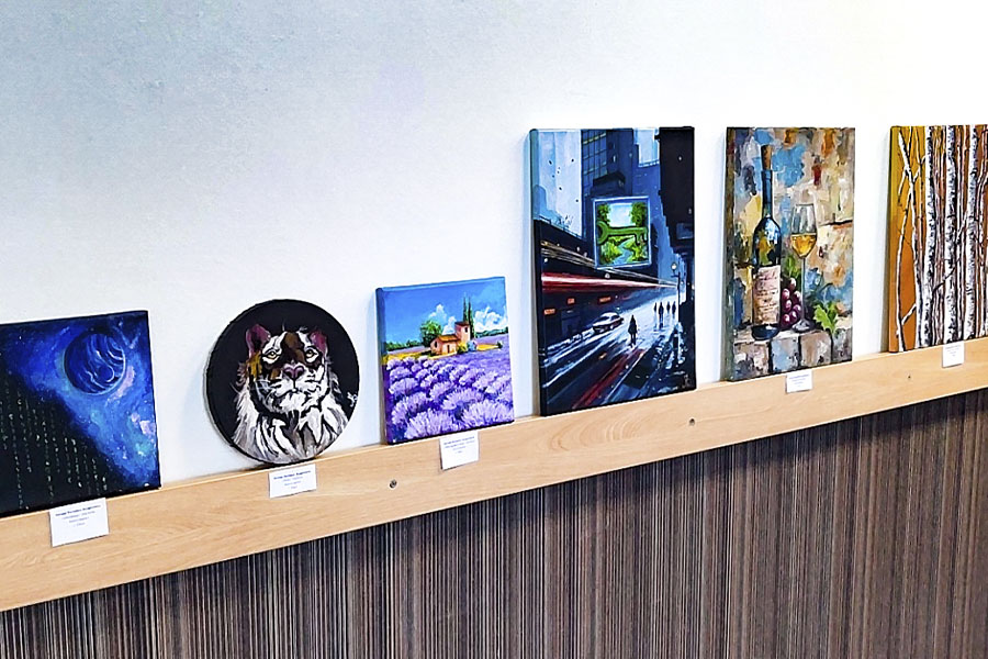 Зрители увидели около 20 картин, написанных акриловыми красками на холстах и выполненных в разных жанрах и техниках. Здесь были представлены интерьерные сцены, натюрморты, изображения животных и птиц, сюрреалистичные изображения и многое другое.