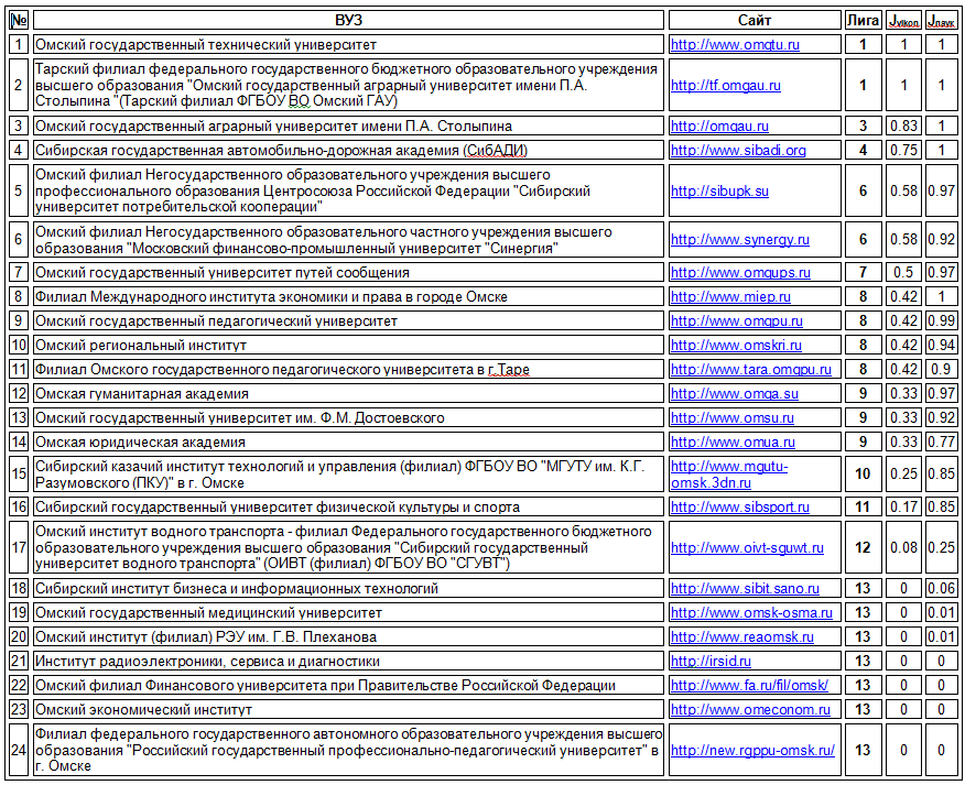 Положение в Рейтинге сайтов всех вузов Омской области: