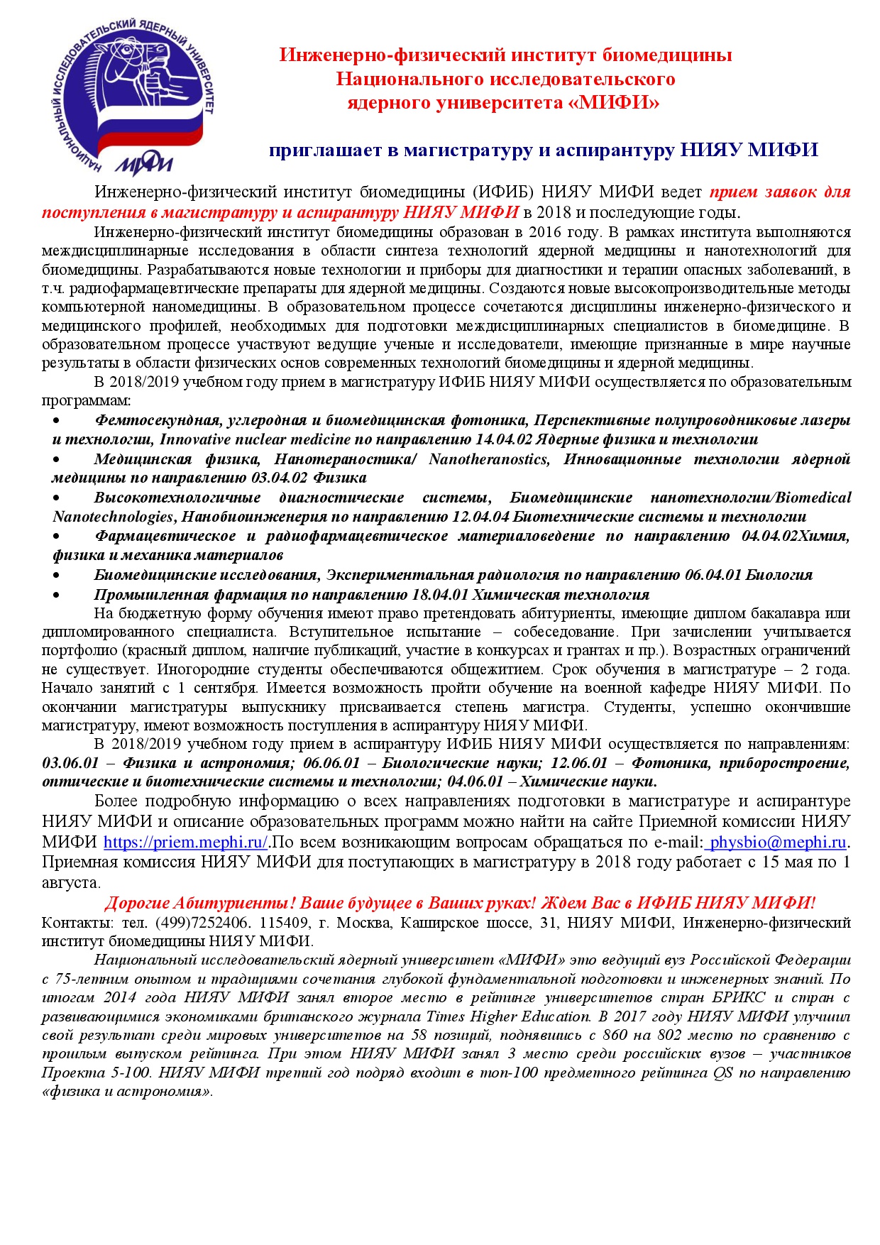 Инженерно-физический институт биомедицины НИЯУ МИФИ приглашает выпускников региональных университетов для поступления в магистратуру и аспирантуру НИЯУ МИФИ в 2018 году