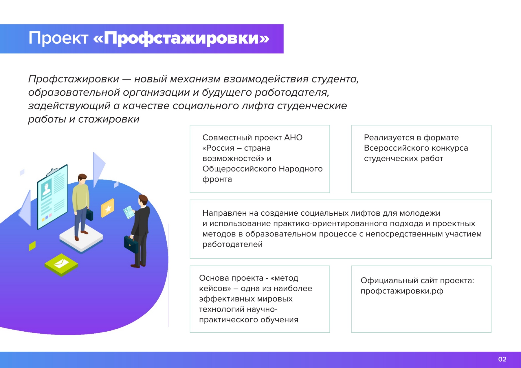 В целях содействия в решении задач, поставленных в Указе Президента РФ В.В. Путина от 07 мая 2018 г. № 204 "О национальных целях и стратегических задачах развития Российской Федерации на период до 2024 года", и во исполнение федерального проекта "Социальные лифты для каждого" реализуется проект "Профстажировки". Начиная с 10 сентября 2019 года, любой обучающийся сможет выбрать на платформе профстажировки.рф один из кейсов и, по согласованию с научным руководителем, посвятить его решению тему своей студенческой работы.