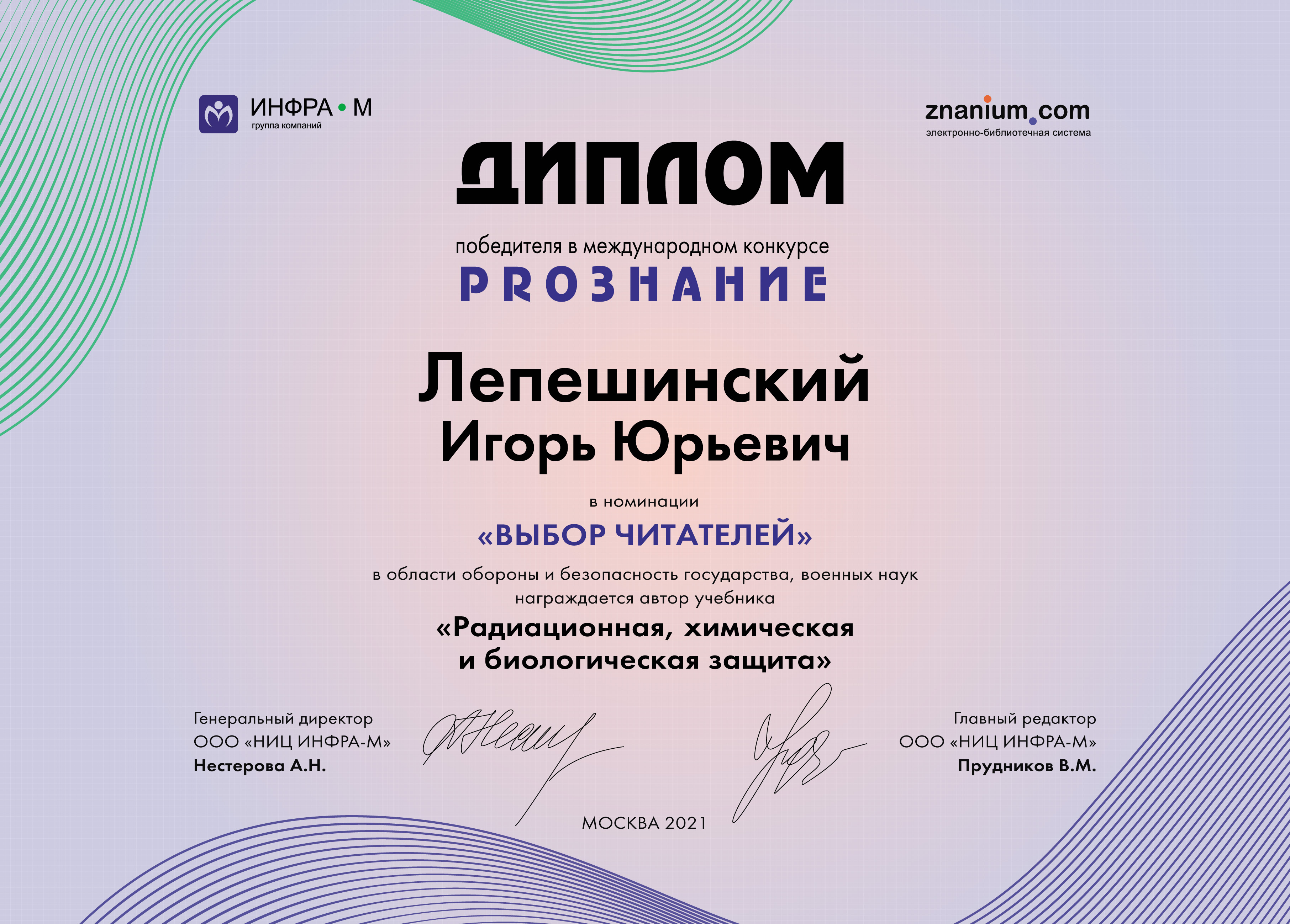 Победителем в области «обороны и безопасности государства, военных наук» в номинациях – «Самый читаемый электронный учебник» и «Выбор читателя» стал учебник «Радиационная, химическая и биологическая защита». Издание подготовлено полковником, директором института военно-технического образования ОмГТУ И. Ю. Лепешинским в соавторстве с преподавателями военного учебного центра полковником В. А. Кутеповым и полковником В. П. Погодаевым.