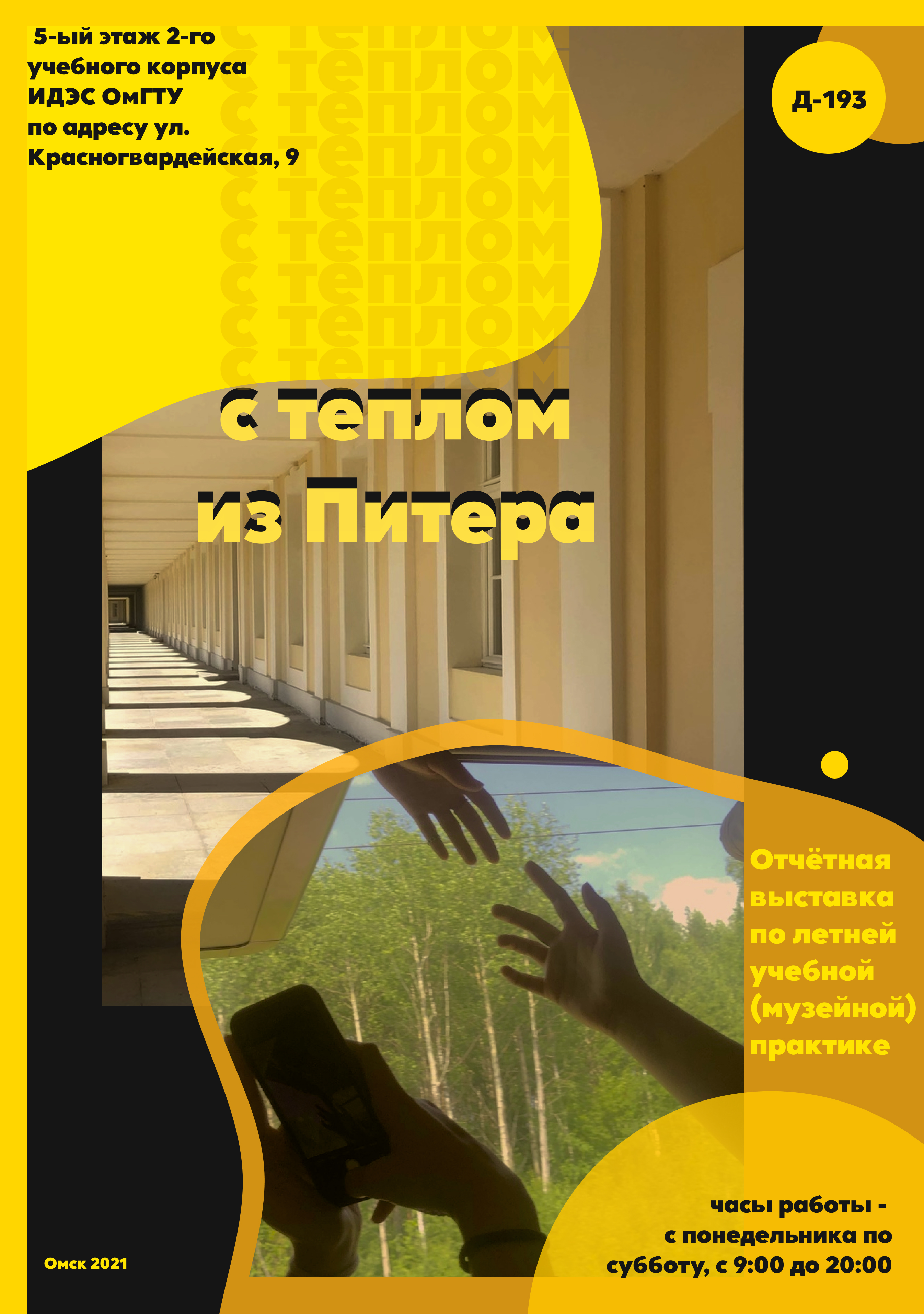 30 сентября в 14:00 на 5 этаже учебного корпуса ИДЭС ОмГТУ по адресу ул. Красногвардейская, д. 9, открывается отчётная выставка студенческих работ по летней выездной практике в г. Санкт-Петербург (руководитель Весёлкина Мария Вячеславовна). Приглашаем всех желающих окунуться в атмосферу этого невероятного города и посмотреть на него глазами юных дизайнеров! Выставка продлится по 30 октября.