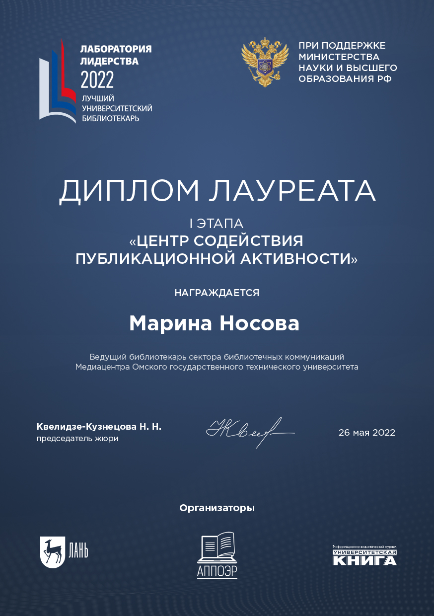 В конкурсе приняли участие более 130 сотрудников вузовских библиотек из всех регионов России. Одним из 5 лауреатов первого этапа стала Марина Носова, ведущий библиотекарь научной библиотеки Омского государственного технического университета.