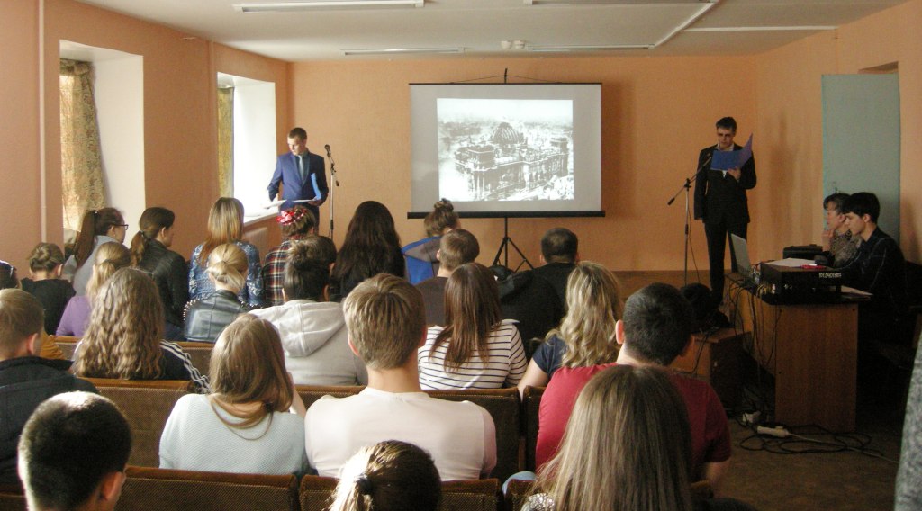 При этом, студентом 1 курса ЭНИ Макаренко Максимом и студентом 2 курса ЭНИ, председателем студенческого совета Плотниковым Георгием была проведена большая творческая работа по фото и видео монтажу тематического материала тех далёких лет, оформлено соответствующее музыкальное сопровождение, проведены многочисленные репетиции, где ведущие Будэй Александр (студент 2 курса МСИ) и Плотников Георгий с присущей им самоотдачей и большим желанием провели знаменательные мероприятия.