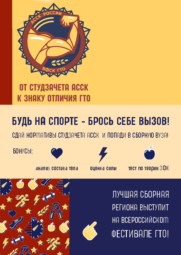 Основной целью реализации проекта «От студзачета АССК к знаку отличия ГТО» является пропаганда и вовлечение студентов в подготовку и выполнение нормативов испытаний (тестов) Комплекса ГТО и развитие массового студенческого спорта в вузах.
