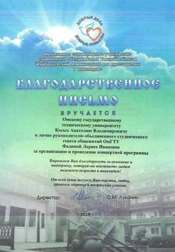 Руководство дома-интерната наградило коллектив ОмГТУ благодарственным письмом и вновь попросило нас приехать с праздничной тематической программой в канун Дня Победы.